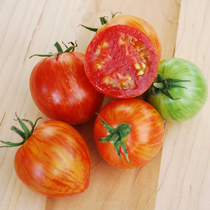65-70 days. This newcomer commanded attention in trials and we're sure it will do the same in your garden! Beautiful, orange and red striped, 2 to 2½", unique fruits mature to a miniature oxheart shape – a delightful twist on a long time heirloom favorite. Flesh is juicy and meaty with a mildly sweet, slightly acidic flavor. Great fresh from the garden or cooked. High yields. Indeterminate.