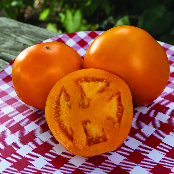 (FTA ToMV) 75 Days. 2014 AAS Winner! Bred from the popular heirloom tomato Amana Orange, this variety captures the wonderful flavor and unique color of the heirloom, but with much earlier maturity so you can begin enjoying the fruits sooner - also features an improved disease resistance. Beefsteak-type, 5 to 6" fruits have a flattened globe shape and average 9 to 12 oz. each. Bright orange, almost neon, both inside and out - won't fade or discolor when cooked. Tomato Mosaic Virus resistant. Indeterminate.