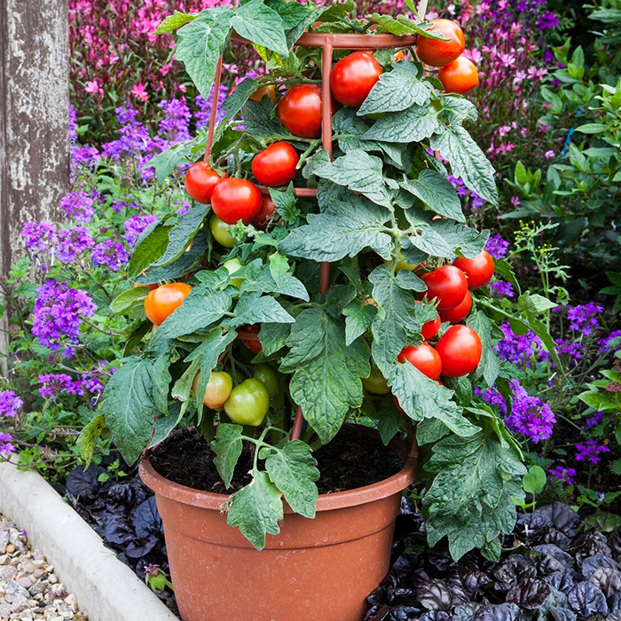 65 days. Bright red, 3 to 4", juicy fruits have an excellent sweet flavor with a Brix of 6 and grow in clusters of 2 to 3. Makes an excellent slicer. Foliage remains dark green and healthy providing good fruit cover from sunscald throughout the entire season. Although bushy plants only grow 24 to 32" tall, they have strong, sturdy stems and are able to maintain the weight of fruits with minimal support. Great for containers and small space gardens. Exhibits high tolerance to Late Blight. High yielding. Determinate.