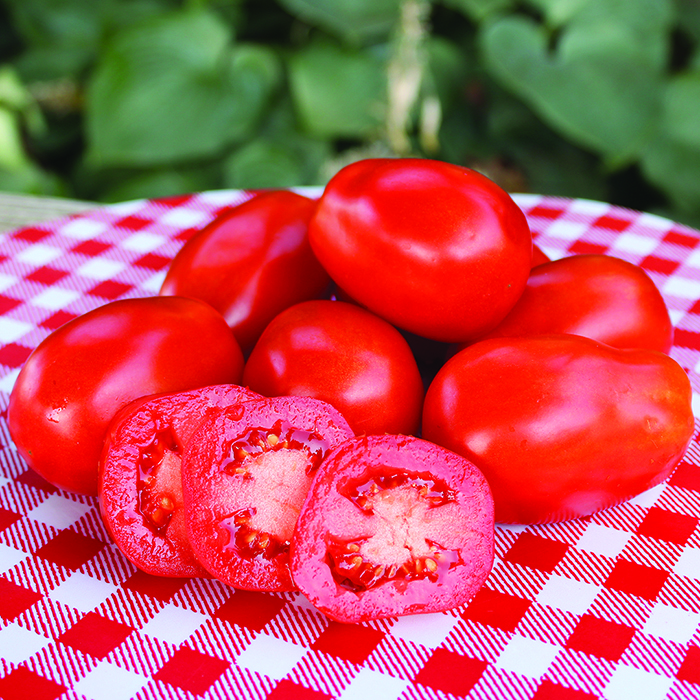 (VF) 75 Days. Roma is considered to be the most well-known paste-type tomato, perfect for sauces, pastes and ketchup. Heavy crops of bright bright red, pear-shaped fruits are nice and meaty, with very few seeds. Determinate