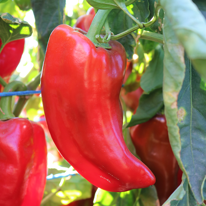 82 days. Large, uniformly shaped, kapia-type fruits are firm, approx. 7½" long by 2½" wide, ripen from green to a rich, deep red and have an excellent quality. Horn-shaped, 2 to 3-lobed fruits weigh up to 7 oz., have thick, meaty walls, are very crunchy and have a light, sweet flavor similar to a bell pepper. Stores well without losing quality or flavor. A versatile type that originated from Turkey where it was used for paprika production. Strong, vigorous plants provide good leaf coverage to protect fruits against sunscald. An excellent choice for home gardeners and farmers markets. Ideal for container gardening. Highly resistant to Tobamovirus. High yielding.