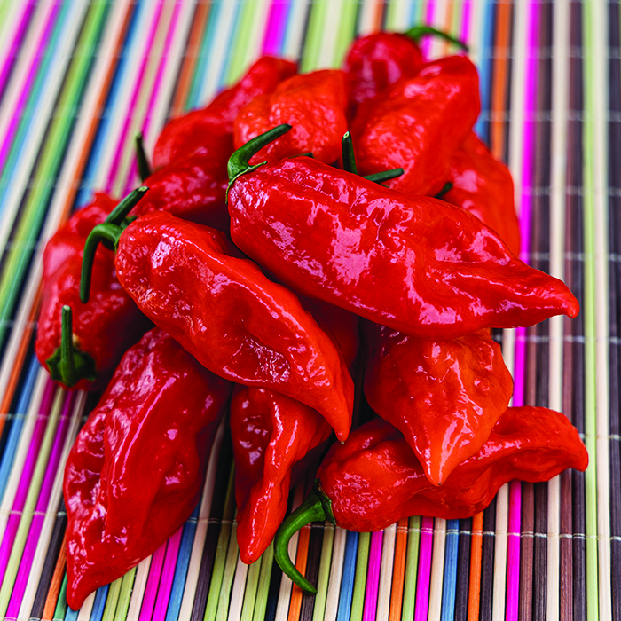 Caution! With an extremely high heat level- an estimated Scoville rating of more than 800,000 - this hybrid Ghost pepper seriously brings the heat. Smooth skinned, deep red, pointed, lantern shaped, 2 1/2" peppers are very attractive and wrinkled like Habaneros. Fruits mature about 10 to 12 days earlier and have higher yields than open-pollinated ghost varieties.